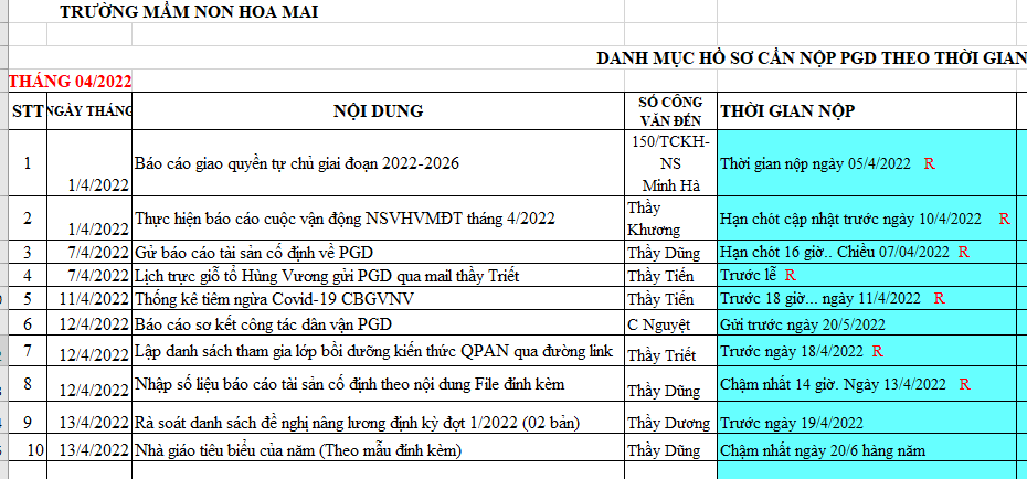 | Chiều | Thực hiện nhiệm vụ tại trường | BTCB- Hiệu trưởng: cô Mai | Trường Mầm non Hoa Mai | ||